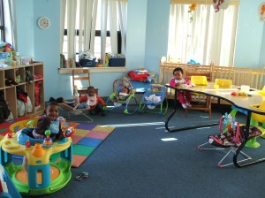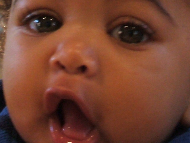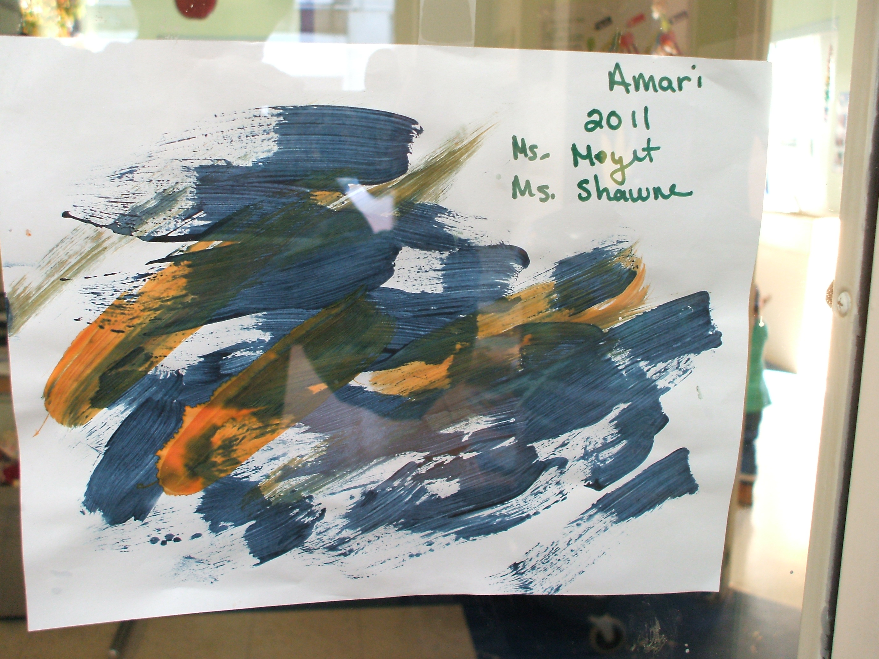children are taping into their creative cores. Ms. Miyet held the hand of 15 month old Amari holding the brush to paint this abstract design and the 4 month child expresses delight in what he sees!