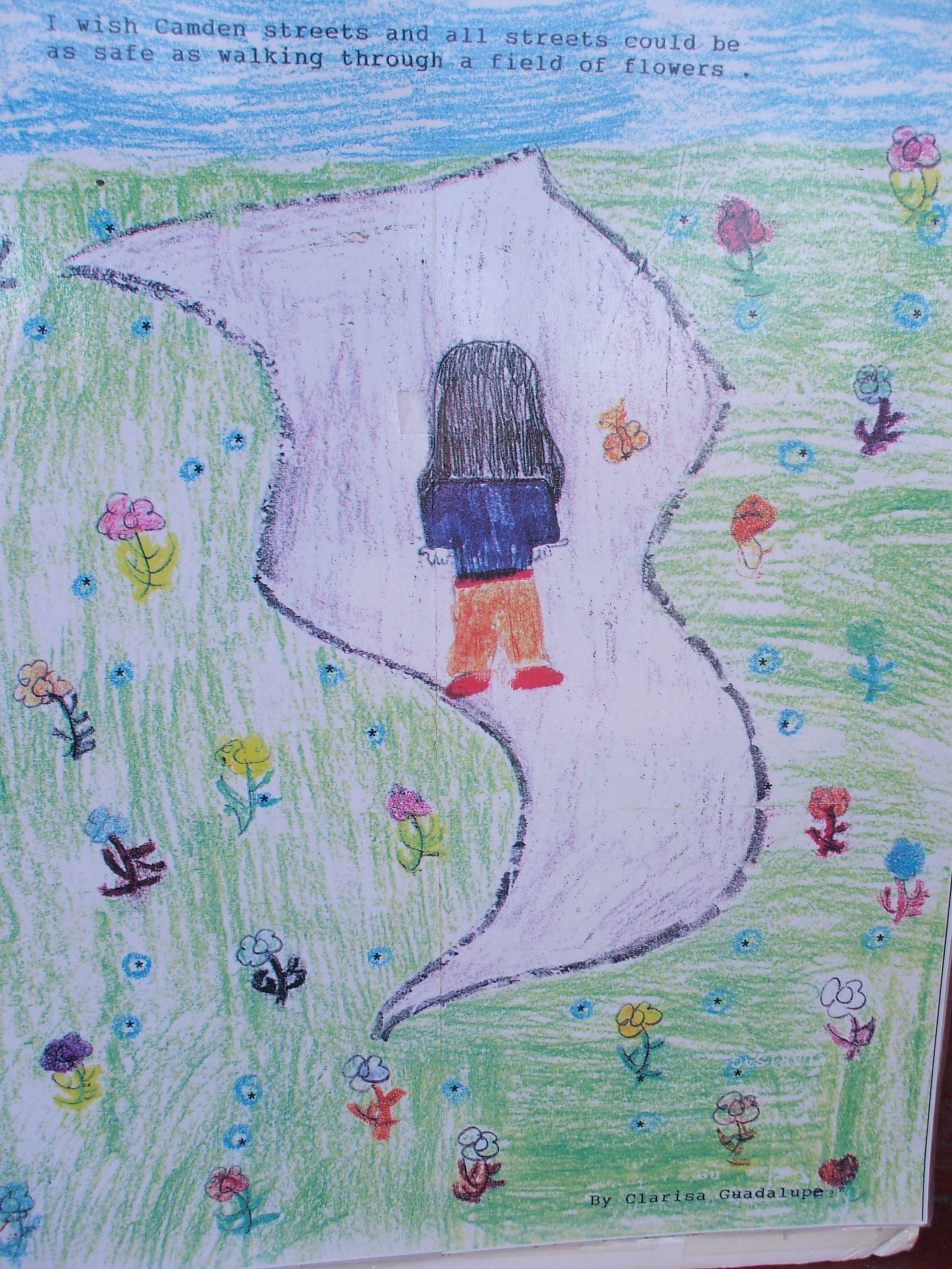 “The calendar was a great project but it took so much time to raise funds and distribute the 10,000 copies we had little time in the classroom. So in 2002, I changed from an Art Aware calendar to a yearly poster of “Camden Children at Peace Doing Art.” We produce different sized color posters and distribute about 300 of them yearly to the schools and the communities that put them on display. They have been in the schools, post offices, supermarkets, City Hall, Robert Wood Johnson Medical School, and even at a special, very large, ten-month exhibition at Cooper Hospital. The 2008 poster represents student artwork, initiated by their art teachers, from 17 schools.”