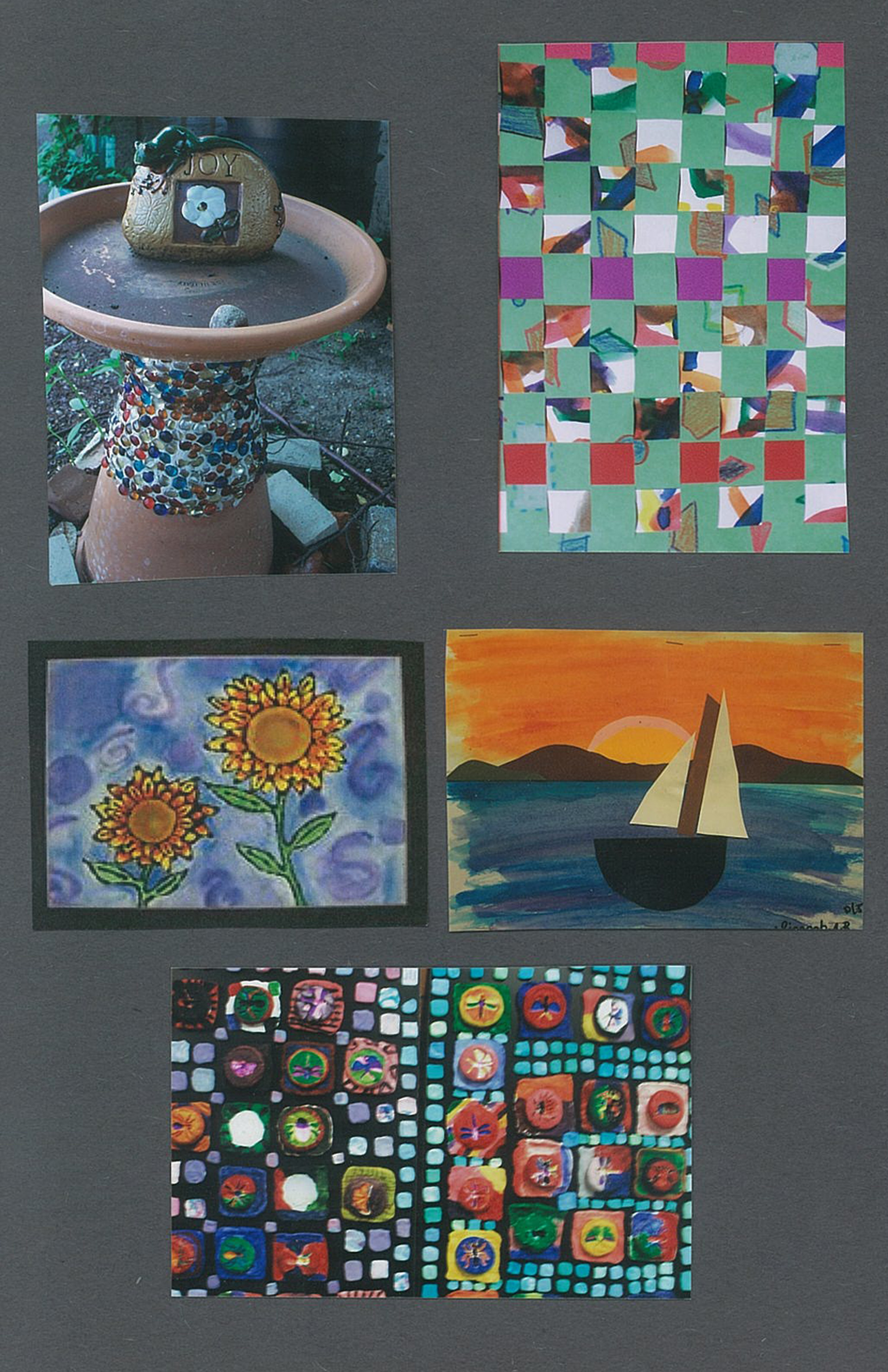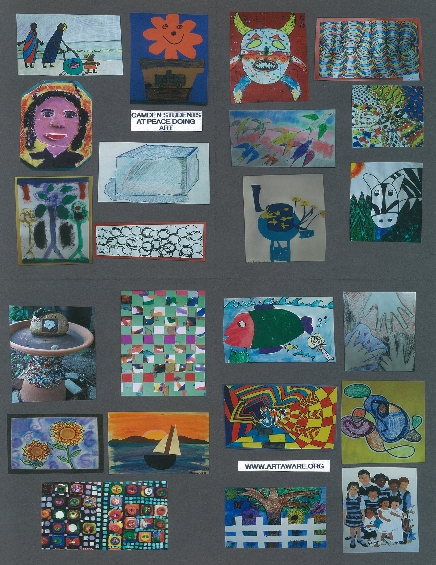 Here is the 2012 CAMDEN STUDENTS AT PEACE DOING ART poster and the names of the terrific art teachers from 23 public, charter and parochial schools initiating the work (starting from 1st of 4 quadrants): *Ms.Watkins, Cramer School – Walking Baby(4th grade); *Ms. Jones, Forest Hill – Flower Pot(K); *Ms. Babilonia, H.B.Wilson – Park with Trees(K); *Ms. DiMedio, Davis – Melting Ice Block(5); *Ms.Kring-Schreifels, Camden Forward, Self-Portrait in Clay(3); *Ms. Allen, Whittier – Black Circle Stamps(Pre-K); *Ms. Wallenburg, Ms. Knopp, Coopers Poynt – Mask(7); *Ms. Deets, St. Joes Pro-Cathedral – Slinkies(8); *Ms. Savarese, Sumner – Swallows(3); *Ms. Lippincott, Lanning Square – Playcard Pattern(4); *Ms. Saeger, Sharp – Matisse Goldfish Collage(2); *Ms. Guida, Wiggins – Zebra(4); *Ms. Subramanya, ECO Charter – Bird Bath; *Ms. Manning, Weaving(3); *Ms.Speart, Leap Academy – Sunflowers(4); *Ms. Dubbs, Catto – Land/Seascape collage(5); *Ms. Gail, Mr. Rohr, Bonsall – Clay Bug Tile Mosaic(5); *Ms. Cucinotta, Sacred Heart – Fish/Diver collage(2); *Ms. Sassano, Washington/Veterans – Fingerplay(5); *Ms. Demarais, Ms. Moore, Molina – Abstract on Yellow(1); *Ms. Spann, Dudley – White Fence(5); *Ms. Guzman, Holy Name – Mural of School Family(volunteers).