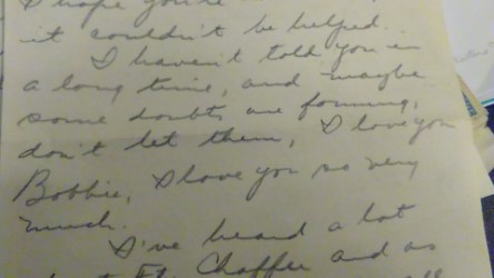 Those of us of a certain age are trying to scale down. The things I hold dear are books, letters, lesson plans and my kids-by proxy art work. This morning when I opened a box from long ago, thinking I could throw a lot of it away, on top was a 1959 letter from my first love: Pvt. Edward Whipple, NG13589311, B-1 SSC, class 313, Fort Chaffee, Ark. It was a three-page apology for not having written but saying he loved me “so very much.”